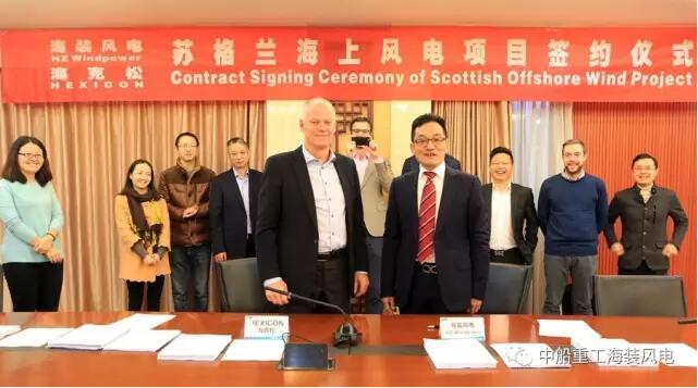 2016年12月22日,海裝風(fēng)電與英國(guó)10MW海上浮動(dòng)平臺(tái)風(fēng)電項(xiàng)目業(yè)主HEXICON AB 在重慶簽署供貨合同。公司副總經(jīng)理孟黎及業(yè)主方CEO 安德斯•巴恩分別代表雙方簽字,標(biāo)志著海裝風(fēng)電5MW海上風(fēng)電機(jī)組裝備獲得國(guó)際市場(chǎng)認(rèn)可、成功布局海外主流海上風(fēng)電市場(chǎng)。