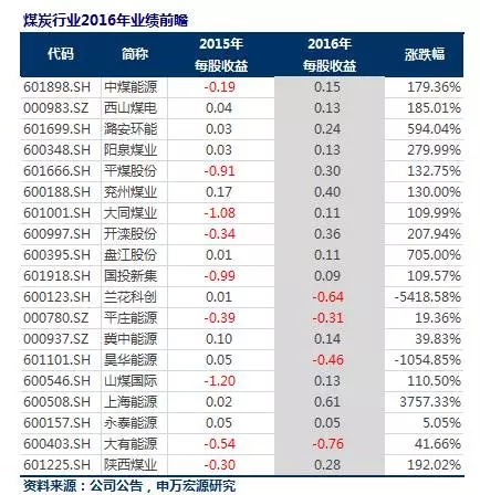 (2)同比扭虧為盈的公司有6個(gè):中煤能源(0.15,公司今年以來通過優(yōu)化結(jié)構(gòu),降低成本,加之煤價(jià)上漲帶來盈利改善使得公司扭虧為盈)、平煤股份(0.3,公司將部分虧損嚴(yán)重的礦井剝離給集團(tuán),實(shí)現(xiàn)大幅減虧,改善盈利。)、大同煤業(yè)(0.11,公司將虧損嚴(yán)重的燕子山煤礦、國(guó)貿(mào)公司剝離給集團(tuán),實(shí)現(xiàn)改善盈利。加之受益于供給側(cè)改革煤價(jià)上漲)、開灤股份(0.36,公司主要受益于焦煤、焦炭?jī)r(jià)格的上漲,公司業(yè)績(jī)?cè)鲩L(zhǎng)明顯)、*ST新集(0.09,受益于三四季度煤價(jià)上漲,公司實(shí)現(xiàn)扭虧為盈)、*ST山煤(0.13,公司扭虧為盈;主要受益于供給改革以來煤價(jià)上漲)