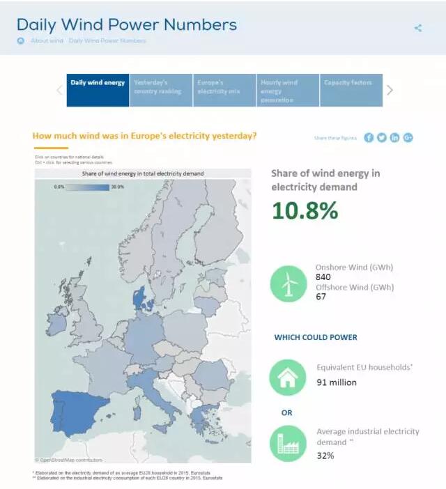 該平臺(tái)的第一個(gè)模塊顯示,風(fēng)電每天為數(shù)以百萬計(jì)的歐洲家庭和企業(yè)提供電力。去年風(fēng)電覆蓋了歐盟電力需求的10.4%。在一些日子里,在部分成員國(guó)則覆蓋了超過100%的電力需求。