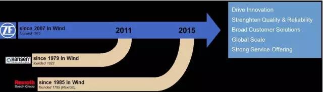 2007年,采埃孚(ZF)憑借其在車輛變速箱領(lǐng)域積累的豐富經(jīng)驗(yàn)開始向Vestas批量供貨風(fēng)電齒輪箱;2011年,收購(gòu)Hansen;2015年,收購(gòu)Rexroth風(fēng)電齒輪箱業(yè)務(wù)。