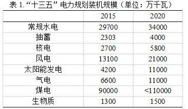 “十三五”期間,全國常規(guī)水電新增投產(chǎn)約4000 萬千瓦,開工6000 萬千瓦以上,到2020 年,常規(guī)水電裝機達到3.4 億千瓦,抽水蓄能電站裝機新增約1700 萬千瓦,達到4000 萬千瓦左右;全國核電投產(chǎn)約3000 萬千瓦,開工3000 萬千瓦以上,2020 年裝機達到5800 萬千瓦。2020 年,風(fēng)電裝機達到2.1 億千瓦以上;太陽能發(fā)電裝機達到1.1 億千瓦以上。“十三五”期間,氣電新增投產(chǎn)5000 萬千瓦,2020 年達到1.1 億千瓦以上。“十三五”期間,取消和推遲煤電建設(shè)項目1.5 億千瓦以上;煤電裝機規(guī)模力爭控制在11 億千瓦以內(nèi)。