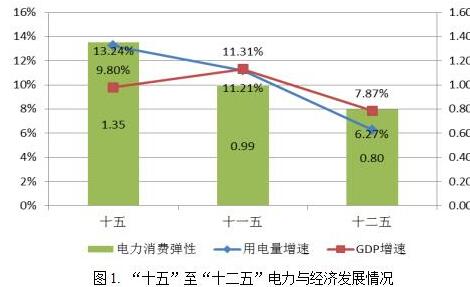 從歷史發(fā)展趨勢來看,2000年以來我國用電量增速總體呈現(xiàn)下降的趨勢,由“十五”期間的13.24%降低到“十二五”期間的6.27%,“十三五”期間用電量增速還將進一步下降,這也已是毋庸置疑的現(xiàn)實。同樣,我國經(jīng)濟發(fā)展也經(jīng)歷了從高速發(fā)展到新常態(tài)的轉(zhuǎn)變,“十二五”GDP增速明顯放緩,同時全社會用電量增速也明顯調(diào)檔;尤其是2014年以來,隨著步入經(jīng)濟新常態(tài)、產(chǎn)業(yè)結(jié)構(gòu)調(diào)整、用電結(jié)構(gòu)的逐步優(yōu)化等因素,全社會用電量增速顯著下降。2000年以來,電力消費彈性這一指標也保持下降趨勢,這種下降趨勢將一直延續(xù)到“十三五”乃至今后很長一段時間,這也是社會發(fā)展的一般規(guī)律。