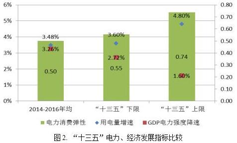 根據(jù)“十三五”規(guī)劃綱要的發(fā)展目標,“十三五”期間GDP年均增速要保持在6.5%以上,預(yù)計到2020年,我國GDP總量將達到94.4萬億元。結(jié)合電力發(fā)展規(guī)劃目標,預(yù)計“十三五”我國電力消費彈性系數(shù)約為0.74。由表2中的數(shù)據(jù)可以看出,以電力消費彈性這一指標來看,從“十五”到“十三五”,該指標一直呈下降趨勢。然而,“十三五”期間電力彈性能否維持0.74的水平,這仍然是一個值得深思的問題;也就是說“十三五”期間,年均4.8%甚至更高的用電量增速是值得深究的。