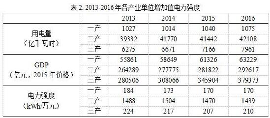 為更好地把握“十三五”期間電力需求態(tài)勢,本文對于近4年(2013-2016年)三次產(chǎn)業(yè)的增加值電力強度做進一步分析。總體來看,三大產(chǎn)業(yè)的電力強度均呈現(xiàn)下降的趨勢,盡管出現(xiàn)個別年份出現(xiàn)小幅反彈的情況,但是總體依舊處于下降通道。