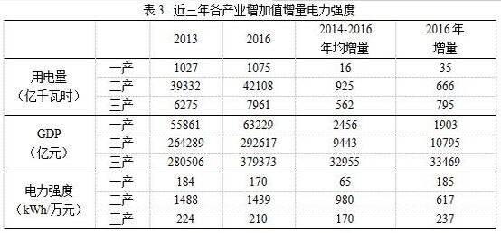 進一步,對三次產(chǎn)業(yè)近三年的增加值增量與用電量增量的關(guān)系進行分析。結(jié)果表明,平均來看,各產(chǎn)業(yè)近三年增加值增量部分的電力強度均比對應(yīng)年份的總體水平低,“二產(chǎn)”尤為明顯,這也與各產(chǎn)業(yè)電力強度持續(xù)下降的趨勢吻合。