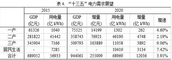 僅從“十三五”的第一年來看,各產(chǎn)業(yè)增加值增量中,第一產(chǎn)業(yè)和第三產(chǎn)業(yè)的電力強度略高于較近三年總體水平,而第二產(chǎn)業(yè)的電力強度要顯著低于近幾年總體水平。隨著產(chǎn)業(yè)結(jié)構(gòu)的進一步調(diào)整,高耗能行業(yè)用電量的飽和以及去產(chǎn)能的進一步深入,第二產(chǎn)業(yè)電力強度將進一步下降,而第一產(chǎn)業(yè)與第三產(chǎn)業(yè)電力強度則相對穩(wěn)定。預(yù)計“十三五”期間各年度三大產(chǎn)業(yè)電力強度將會維持下降趨勢不變,而其中第二產(chǎn)業(yè)的電力強度將會出現(xiàn)較明顯的下降。根據(jù)2016年三大產(chǎn)業(yè)增加值增量部分對應(yīng)的電力強度對2020年各產(chǎn)業(yè)用電量進行了展望,同時假設(shè)居民用電增速保持“十二五”期間的平均水平。預(yù)計到2020年全社會用電量約6.9萬億千瓦時,年均增速約3.91%,具體到產(chǎn)業(yè)來看,第一產(chǎn)業(yè)、第二產(chǎn)業(yè)、第三產(chǎn)業(yè)用電量年均增速分別為4.60%、2.19%、9.06%。
