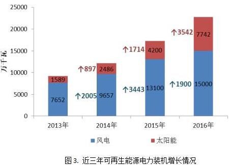 從近三年可再生能源電力裝機增長情況來看,風(fēng)電和太陽能裝機規(guī)模均快速增長,可再生裝機規(guī)模年均增長約4500萬千瓦。具體來看,截至2016年,我國風(fēng)電裝機規(guī)模1.5億千瓦,近三年年均增長約2500萬千瓦;太陽能裝機規(guī)模7742萬千瓦,近三年年均增長約2000萬千瓦。而根據(jù)“十三五”電力規(guī)劃的發(fā)展目標,2020年風(fēng)電裝機在2015年1.3億千瓦的基礎(chǔ)上新增約8000萬千瓦,年均投產(chǎn)僅1600萬千瓦,太陽能裝機規(guī)模目標為1.1億千瓦,新增6800萬千瓦,年均投產(chǎn)僅1360萬千瓦。與近幾年的發(fā)展趨勢相比,按照規(guī)劃目標,可再生電力發(fā)展速度卻將明顯放緩。