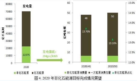 從非化石能源目標來看,根據(jù)“十三五”電力規(guī)劃,預(yù)計2020年我國非化石能源發(fā)電量為2.24萬億千瓦時。按照310gce/kWh的供電煤耗目標(對應(yīng)的發(fā)電煤耗水平約294gce/kWh)核算,非化石電力生產(chǎn)對應(yīng)的一次能源供應(yīng)量為約6.6億噸標煤。按照50億噸標準煤的一次能源消費預(yù)期目標來計算,電力非化石一次能源占比僅為13.2%,15%的非化石能源占比目標料難完成。我們考慮2020年50億噸標煤的一次能源消費量目標可能過于樂觀;但即便是按照較為合理的48億噸標準煤來計算,電力非化石能源在一次能源中的占比也僅為13.7%,與15%的目標仍有較大差距。