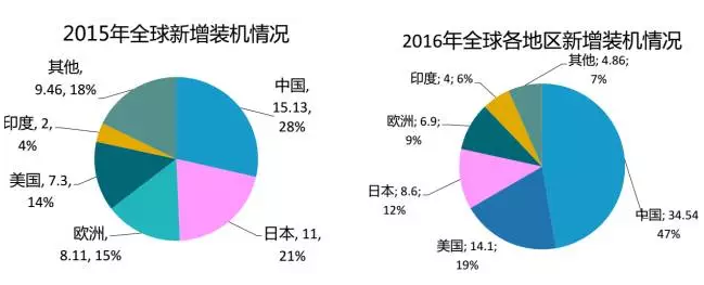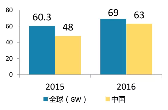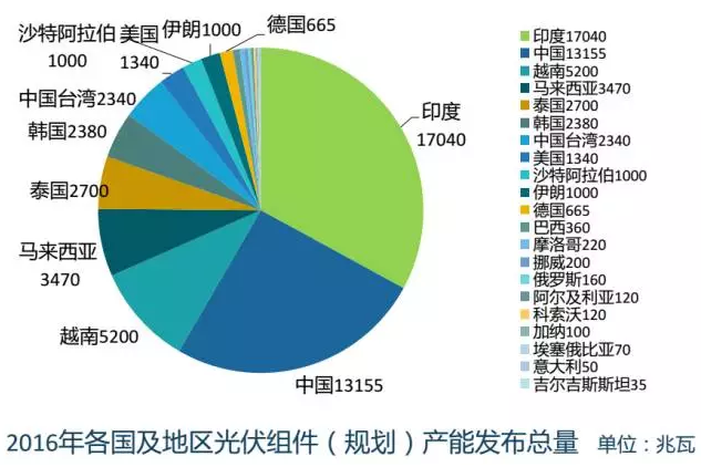 2016年全球光伏新增裝機(jī)約73GW,其中中國34.54GW,美國14.1GW、日本8.6GW、歐洲6.9GW、印度4GW。歐洲和日本等傳統(tǒng)市場的市場占比逐步向中國、美國、印度等市場轉(zhuǎn)移;一批新興市場正在加速發(fā)展。