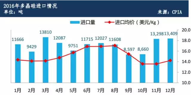 規(guī)模:2016年,我國多晶硅產(chǎn)量約19.4萬噸,同比增長17.6%。全年太陽能級(jí)多晶硅進(jìn)口量約13.6萬噸(含硅錠);