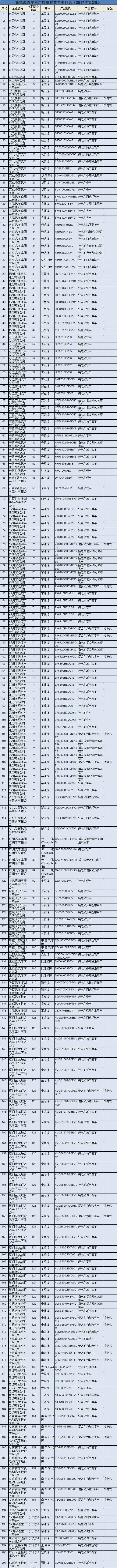 3月1日,工信部發(fā)布第二批《新能源汽車推廣應(yīng)用推薦車型目錄》,共有40家企業(yè)201款車型進(jìn)入目錄。其中,新能源乘用車36款、新能源客車128款、新能源專用車37款。1月23日,工信部發(fā)布了《新能源汽車推廣應(yīng)用推薦車型目錄》(2017年第1批)相關(guān)車型及主要參數(shù)。2017年第一批進(jìn)入新能源汽車推薦目錄的車型共有185款,其中,新能源物流車36款、新能源乘用車73款、新能源客車76款,覆蓋的車企有39家。兩批目錄共有386款車型進(jìn)入目錄。
