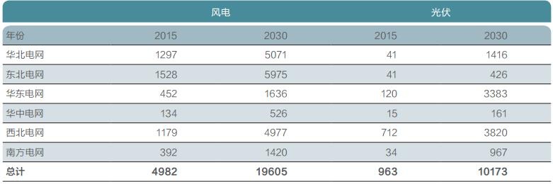 表:分區(qū)域風(fēng)電與光伏能源替代(2015/2030)(單位:萬(wàn)噸標(biāo)準(zhǔn)煤)