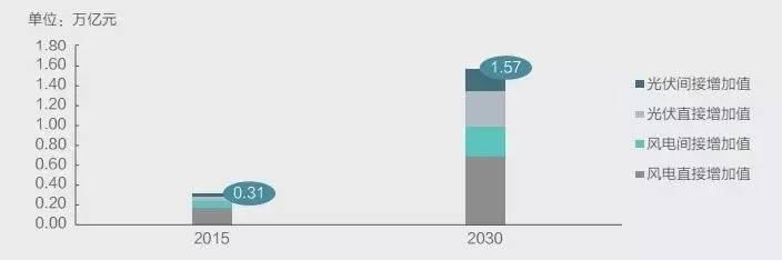 報(bào)告提出,2015-2030年,風(fēng)光發(fā)電將累計(jì)拉動(dòng)GDP增長(zhǎng)約14.3萬(wàn)億元,風(fēng)光發(fā)電所拉動(dòng)直接和間接增加值占GDP增加值比重逐年上升,到2030年占比約達(dá)1.1%。