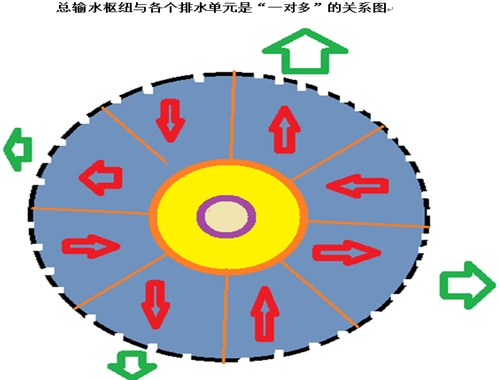 如上圖所示??傮w來(lái)說(shuō),鋼鐵俠機(jī)械手各個(gè)排水單元就像是我們看到的地鐵車廂一樣,一節(jié)一節(jié)的,沿圓周而建,按順序排號(hào),連成一體。單個(gè)排水單元具備獨(dú)立伸縮操作功能,也就是說(shuō)可以單獨(dú)伸展與收縮,與其它單元并不一定同步。因?yàn)橥降脑?,便可能?huì)出現(xiàn)阻水現(xiàn)象。各單元相連,此伏彼起。上圖為一圓形設(shè)計(jì),外周密布單向閥。淺藍(lán)色部分為涌入水庫(kù)的水體,其上設(shè)有一個(gè)總輸水電腦指揮和監(jiān)督崗哨(電腦控制室),實(shí)時(shí)操控和監(jiān)督每個(gè)排水單元的情況,具有“一對(duì)多”信息輻射功能,就像車輪輻射狀那樣。事實(shí)上,各個(gè)排水單元可以是獨(dú)立的個(gè)體,也可以連成一體,每個(gè)排水單元滿水則排,排完就灌,可以自動(dòng)調(diào)節(jié),只要總排水量與涌入水量配合好就行了。上圖的排水方向與入水方向只是其中的一種情況,并不一定都像上面這種情況。另外,這種自己具有伸縮功能的單向閥水庫(kù)可以建成各種形狀,最好都是首尾相連。供專家參考。