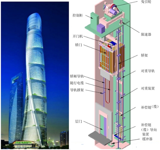 電梯的構(gòu)造,其實(shí)很簡(jiǎn)單,就是鏈條式或皮帶式輪滑組在電動(dòng)機(jī)的帶動(dòng)下飛速運(yùn)動(dòng)。今天時(shí)代的電梯,已經(jīng)達(dá)到非常快的速度。據(jù)說(shuō),目前世界第一高樓迪拜哈利法大廈有56部電梯,速度最高達(dá)每秒17.4米。下面是我國(guó)第一高樓上海中心大廈。