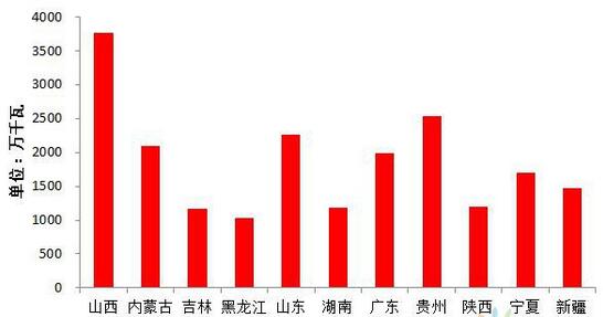 圖4 2020年預(yù)計煤電過剩規(guī)模超過1000萬千瓦的省份分布