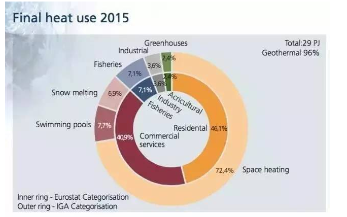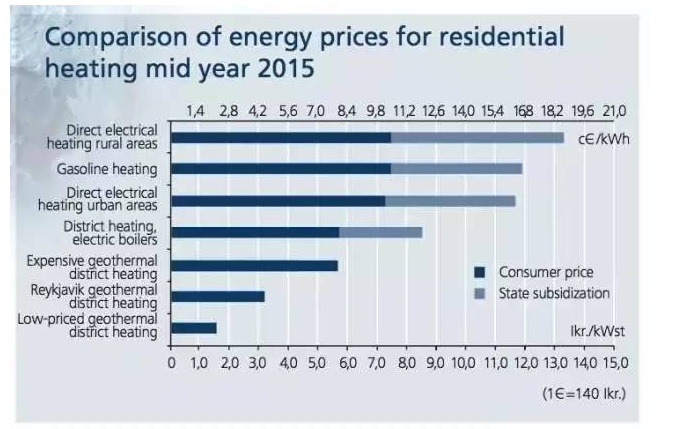 1940年以前,對(duì)燃煤供熱的過(guò)度依賴導(dǎo)致冰島的霧霾問(wèn)題十分嚴(yán)峻。在短暫地轉(zhuǎn)向進(jìn)口石油供熱后,冰島著手大規(guī)模地推進(jìn)地?zé)峁犴?xiàng)目。截至2015年,據(jù)冰島能源局?jǐn)?shù)據(jù),該國(guó)的地?zé)峁岜戎匾呀?jīng)達(dá)到96%,全面覆蓋了居民、商業(yè)、工業(yè)、農(nóng)業(yè)和漁業(yè),環(huán)境問(wèn)題得到改善的同時(shí),供熱價(jià)格也顯著下降。