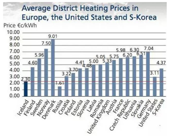 冰島的地?zé)衢_(kāi)發(fā)極具經(jīng)濟(jì)性。冰島能源局局長(zhǎng)Gundi將冰島和同為高緯度北歐城市的丹麥?zhǔn)锥几绫竟墓醿r(jià)格“漢堡包指數(shù)”相對(duì)比,在冰島對(duì)100平方米面積的住房供熱每月該指數(shù)僅為8,而哥本哈根則高達(dá)50。