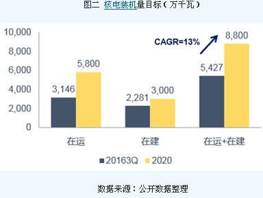 由圖二可知,我國核電預計2020年在運在建裝機將達8800萬千瓦。