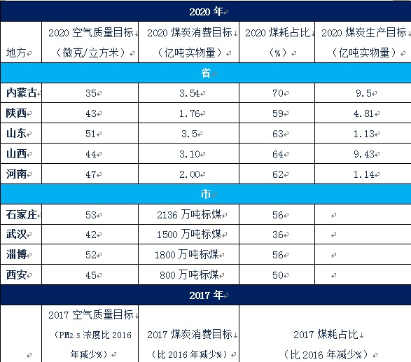 地方試點目標:在2020年地方空氣質量和煤控指標的約束下,2017年地方試點空氣質量和煤耗目標需滿足“大氣十條”的要求,尤其京津冀及周邊地區(qū)空氣質量要有明顯改善見,表1。