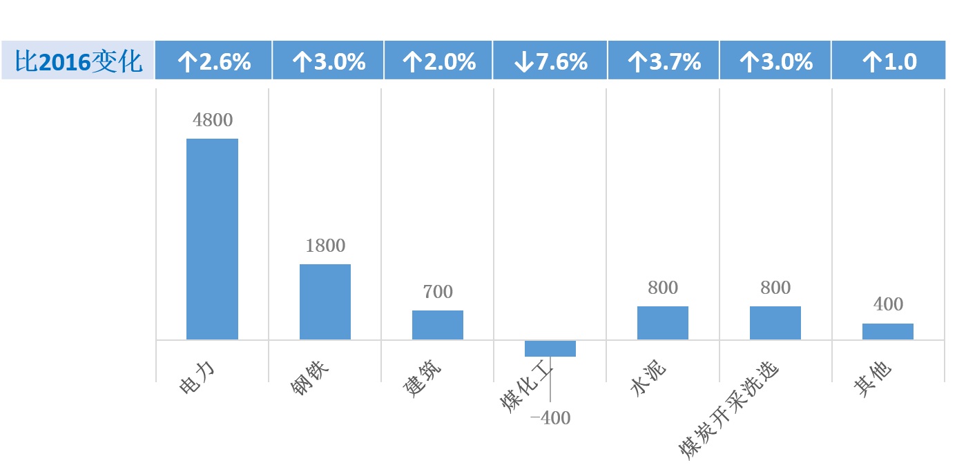 部門煤控目標:2017年煤耗總量下降目標4.2%中,部門的貢獻率在55%以上,即減少0.89億噸煤,其中電力、鋼鐵、水泥、煤化工在4.2%的總目標中貢獻約2%,見圖3。在部門煤控的各項工作中,制定高目標。2017年6月堅決徹底地淘汰地條鋼生產企業(yè)。僵尸企業(yè)在2017年6月底全部清除完畢,技術落后、高污染和安全生產風險高的企業(yè)要停產整頓和關閉,小、散、亂、污企業(yè)要清理。