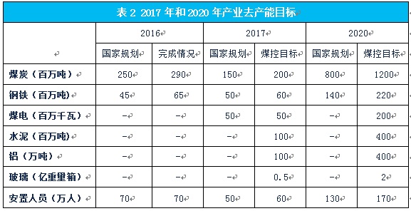 落實和完成2017年“三去一降一補”的煤控目標,以及實現(xiàn)2017年單位能耗和煤耗下降指標。2016年的供給側結構性改革中,鋼鐵煤炭行業(yè)的去產能都超額完成了年度計劃。2017年繼續(xù)抓好去產能的工作。煤控目標中,鋼鐵和煤炭去產能分別為6千萬噸和2億噸以上,見表2。除了鋼鐵和煤炭行業(yè)外,2017年要淘汰、停建、緩建5000萬千瓦煤電廠。除此之外,水泥、鋁、玻璃等行業(yè)去產能分別為1億噸、100萬噸和5千萬重量箱。去產能要抓好、抓實、見實效。做好60萬下崗工人的就業(yè)和安置工作,比政府計劃多安置10萬人。2017年上半年新增煤炭優(yōu)質產能2億噸。在去產能過程中,新增產能的數(shù)量應該用落后產能的相應減少來替代,即2017年的國家去產能規(guī)劃應該是1.5+2=3.5億噸。相應的,煤控項目去產能目標應該是2+2=4億噸。
