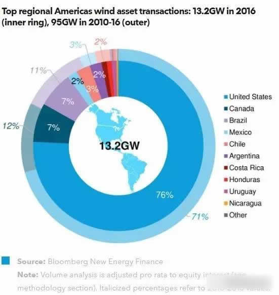 在2016年底,美洲共有148GW的陸上風(fēng)電裝機(jī)容量。根據(jù)公開渠道顯示,從2010年來(lái),至少有33%/49.6GW的容量有經(jīng)歷轉(zhuǎn)手。當(dāng)然其中也有經(jīng)歷轉(zhuǎn)手但暫無(wú)公開信息的項(xiàng)目數(shù)據(jù)。