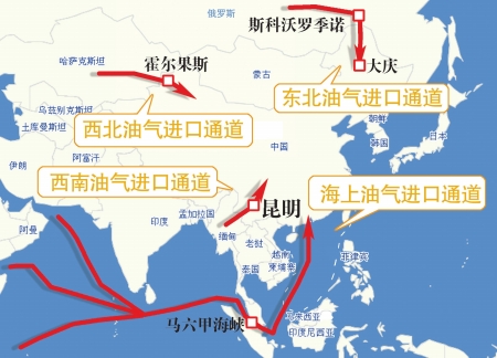 隨著中緬原油管道項目開工,標志著中國的東北(中俄原油管道)、西北(中亞天然氣管道)、西南陸上(中緬油氣管道)和海上(經(jīng)過馬六甲海峽的海上通道)四大油氣進口通道的戰(zhàn)略格局已初步成型,有利于實現(xiàn)石油運輸渠道多元化,保障中國能源供應安全。中緬油氣管道是繼中哈石油管道、中亞天然氣管道、中俄原油管道之后的第四大能源進口通道,緩解了中國對馬六甲海峽的依賴程度,降低海上進口原油的風險。
