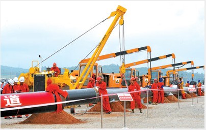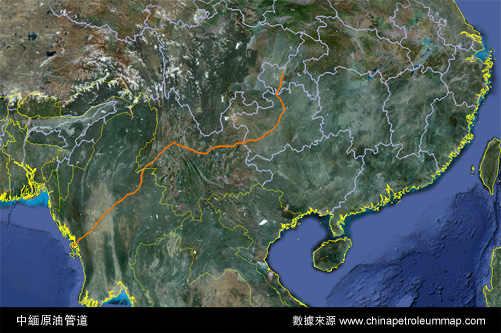 中緬天然氣管道起于緬甸皎漂,途徑四省邦,經(jīng)南坎進入中國瑞麗(云南省西部),管徑1016毫米,長度793公里,年設計輸量120億立方米。管道于2010年6月開始建設,2013年5月底完工并具備投產(chǎn)條件,7月15日進氣開始試運行。