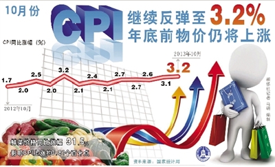10月CPI同比漲3.2% 創(chuàng)8個月新高2013年10月份,全國居民消費價格總水平同比上漲3.2%,漲幅創(chuàng)8個月新高,其中,食品價格同比漲6.5%。肉禽、蛋、果菜、水產(chǎn)品、糧食全線上漲。其中... [詳細]
