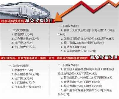 三、規(guī)范和減免鐵路運(yùn)雜費(fèi)。自《措施》印發(fā)之日起至2013年12月31日,呼和浩特鐵路局、沈陽鐵路局、哈爾濱鐵路局等鐵路運(yùn)輸部門,減免部分鐵路運(yùn)雜費(fèi)(見圖)。