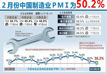 統(tǒng)計局解讀2月PMI:制造業(yè)繼續(xù)擴(kuò)張 企業(yè)信心增強2014年3月1日國家統(tǒng)計局服務(wù)業(yè)調(diào)查中心和中國物流與采購聯(lián)合會發(fā)布的中國制造業(yè)采購經(jīng)理指數(shù)顯示,2014年2月中國制造業(yè)PMI為50.2%,比上月回落0.3個百分點,仍高于臨界點,表明我國制造業(yè)繼續(xù)保持?jǐn)U張態(tài)勢,但增速... [詳細(xì)]