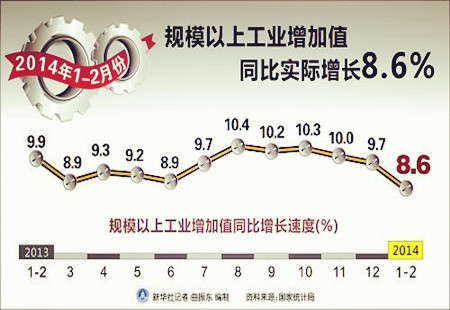1-2月投資、工業(yè)和消費增速均低預(yù)期 經(jīng)濟(jì)下行壓力大2014年1-2月份,規(guī)模以上工業(yè)增加值同比實際增長8.6%(以下增加值增速均為扣除價格因素的實際增長率)。從環(huán)比看,2月份比上月增長0.61%。分三大門類看,1-2月份,采礦業(yè)增加值同比增長3.5%,制造業(yè)增長9.8%... [詳細(xì)]