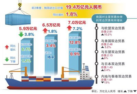 前三季進出口總值僅增1.8% 全年任務(wù)艱巨昨日(10月13日),海關(guān)總署發(fā)布信息顯示,今年前三季度,中國進出口總值19.4萬億元人民幣,比去年同期增長1.8%。其中,出口10.4萬億元,增長3.6%,進口9萬億元,下降0.1%。貿(mào)易順差1.4萬億元,擴大35.3... [詳細]