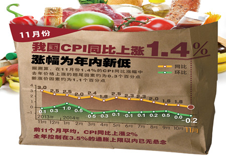 11月CPI、PPI繼續(xù)回落11月,全國居民消費(fèi)價(jià)格總水平(CPI)繼續(xù)回落,同比上漲1.4%,較上月回落0.2個(gè)百分點(diǎn)。11月,全國工業(yè)生產(chǎn)者出廠價(jià)格(PPI)同比下降2.7%,降幅較上月擴(kuò)大0.5個(gè)百分點(diǎn),這是該指數(shù)自2012年3月以來連續(xù)第3... [詳細(xì)]