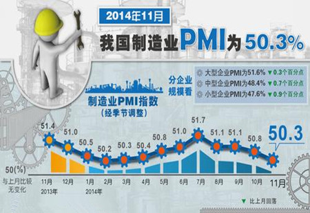 11月中國官方制造業(yè)PMI為50.32014年11月,中國制造業(yè)采購經(jīng)理指數(shù)(PMI)為50.3%,比上月回落0.5個(gè)百分點(diǎn),但繼續(xù)高于臨界點(diǎn),表明我國制造業(yè)總體上仍保持?jǐn)U張態(tài)勢(shì)。 [詳細(xì)]