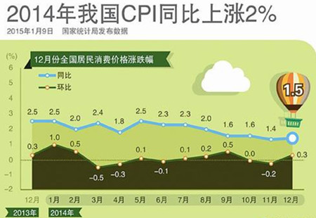 2014年CPI增長2% 漲幅為4年來新低【1月9日訊】2014年12月份,全國居民消費(fèi)價格總水平同比上漲1.5%。其中,城市上漲1.6%,農(nóng)村上漲1.3%;食品價格上漲2.9%,非食品價格上漲0.8%;消費(fèi)品價格上漲1.4%,服務(wù)價格上漲1.8%。2014年,... [詳細(xì)]