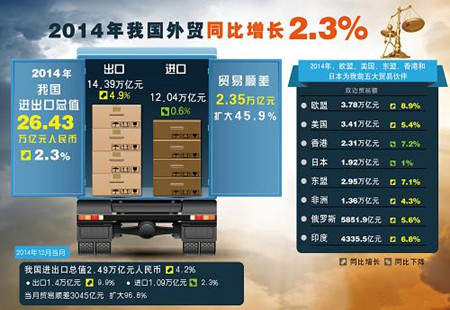 中國2014年進(jìn)出口增長2.3%海關(guān)統(tǒng)計,2014年,我國進(jìn)出口總值26.43萬億元人民幣,比2013年增長2.3%。其中,出口14.39萬億元,增長4.9%;進(jìn)口12.04萬億元,下降0.6%;貿(mào)易順差2.35萬億元,擴(kuò)大45.9%。按美元計價,20... [詳細(xì)]