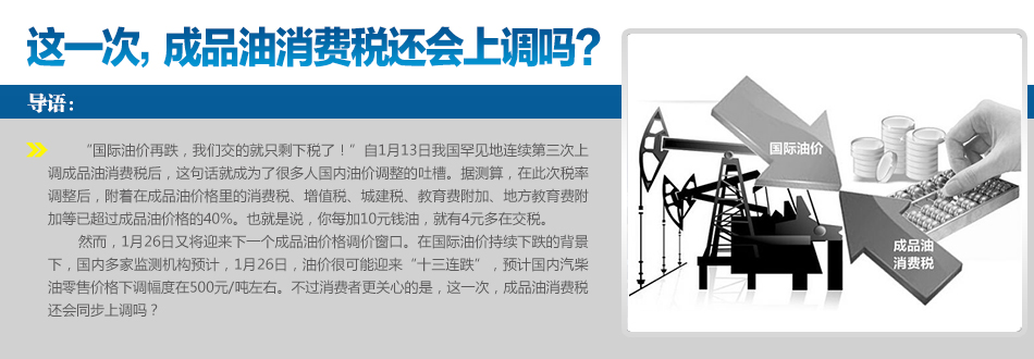在國(guó)際油價(jià)持續(xù)走低的情況下,為了合理引導(dǎo)消費(fèi)需求,減少大氣污染物排放,財(cái)政部、國(guó)家稅務(wù)總局自2014年11月28日至今年1月12日,非常罕見(jiàn)地連續(xù)三次上調(diào)成品油消費(fèi)稅,成品油單位稅額漲幅超50%,引發(fā)... [詳細(xì)]