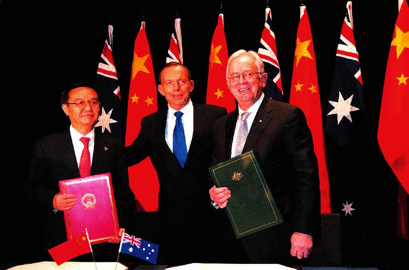 6月17日,堪培拉。在澳大利亞總理阿博特的見證下,啟動于2005年4月、歷時10年談判的中國-澳大利亞自由貿(mào)易協(xié)定最終簽訂。中澳自貿(mào)協(xié)定在內(nèi)容上涵蓋貨物、服務、投資等十幾個領(lǐng)域,實現(xiàn)了“全面、高質(zhì)量和利益平衡”的目標,是我國與其他國家迄今已商簽的貿(mào)易投資自由化整體水平最高的自貿(mào)協(xié)定之一。